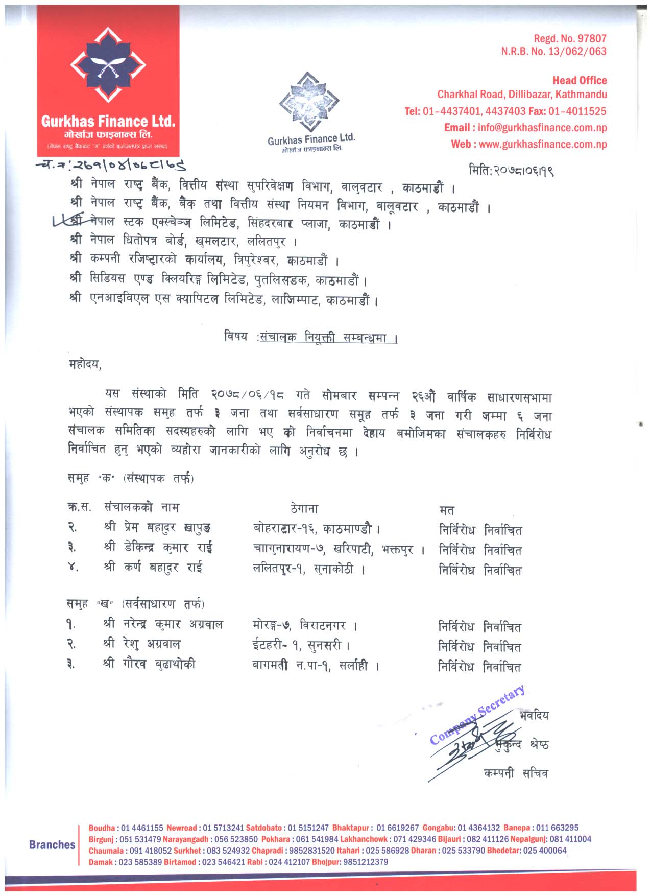 सभाबाट संस्थापकतर्फ प्रेम बहाादुर खापुङ, डेकिन्द्र कुमार राई र कर्ण बहादुर राई निर्विरोध निर्वाचित भएका हुन् भने सर्वसाधारण तर्फ नरेन्द्र कुमार अग्रवाल, रेशु अग्रवाल र गौरव बुढाथोकी निर्विरोध निर्वाचित भएका हुन् ।