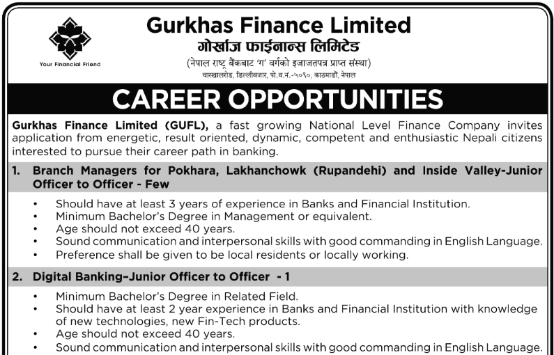 काठमाडौं । गोर्खाज फाइनान्सले विभिन्न पदको लागि कर्मचारी माग गरेको छ । फाइनान्स कम्पनीले ब्रान्च म्यानेजर, डिजिटल बैंकिङ अफिसर, रिकभरी डिपार्टमेन्ट अफिसर, रिलेसनसिप म्यानेजर, जुनियर असिस्टेन्टका लागि केही संख्यामा कर्मचारीको माग गरेको हो ।