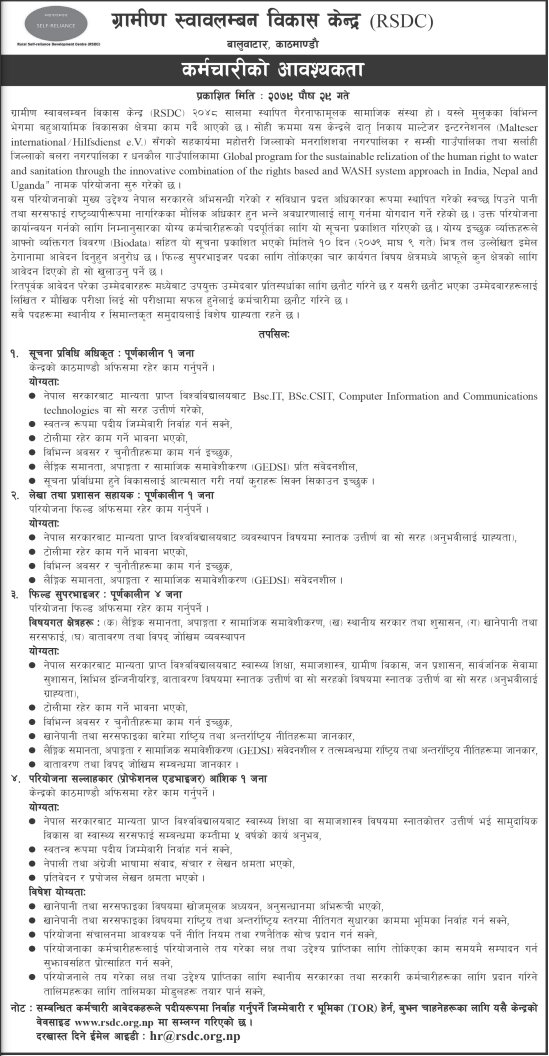 ग्रामिण स्वावलम्वन विकास केन्द्रले माग्यो कर्मचारी