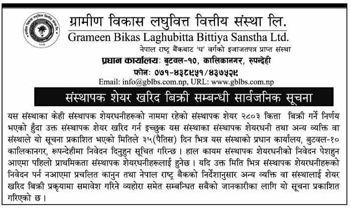 लघुवित्तले राष्ट्र बैंकको निर्देशन बमोजिम सर्वप्रथम संस्थाका संस्थापक शेयरधनीहरुलाई नै प्राथमिकता दिनुपर्ने भएकाले संस्थापक शेयर खरिद गर्न इच्छुक संस्थापक शेयरधनीहरुलाई सूचना प्रकाशन भएको मितिले ३५ दिनभित्र आवश्यक कागजपत्र संकलन गर्न आग्रह गरेको छ ।