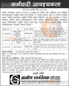 ग्रामीण स्वयंसेबक लघुवित्त वित्तीय संस्था लिमिटेडले विभिन्न पदका लागि केही कर्मचारीहरुको माग गरेको छ । संस्थाले कनिष्ठ अधिकृत आन्तरीक लेखा परीक्षक, कनिष्ठ अधिकृत शाखा प्रमुख र समुह ब्यबश्थापक पदका लागि केही संख्यामा कर्मचारीको माग गरेको छ ।