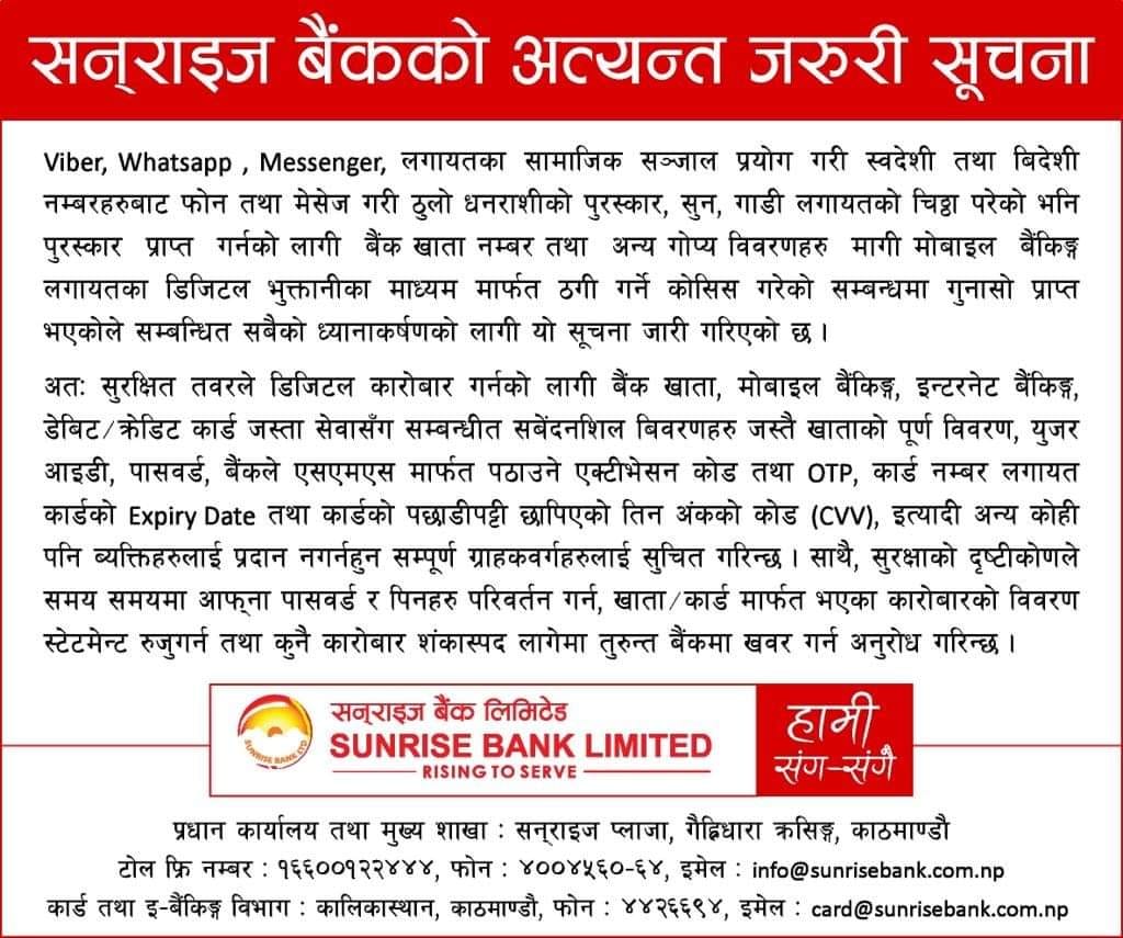 बैंकले वाट्सएप, फेसबुक भाइबर लगायतका समाजिक संजाल र स्वदेश तथा विदशेबाट फोन, म्यासेज गरेर ग्राहकहरुको गोप्य विवरण माग्ने काम गरी डिजिटल भुत्तानीको माध्यमबाट ठगी गर्ने कोशीस भएकोप्रति गम्भिर ध्यानकर्षण भएको बैंकले जनाएको छ ।