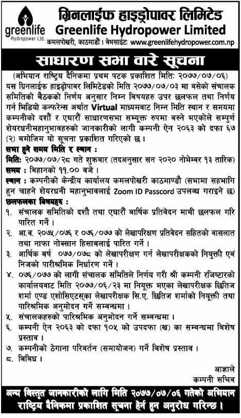 काठमाडौं । ग्रिनलाईफ हाइड्रोपावर कम्पनी लिमिटेडले कार्तिक २८ गते वार्षिक साधारण सभा आह्वान गरेको छ । कम्पनीको कार्तिक ३ गते, सोमबार बसेको सञ्चालक समितिको बैठकले गरेको निर्णय अनुसार कम्पनीको दशौँ र एघारौँ वार्षिक साधारण सभा कार्तिक २८ गते, शुक्रबार कम्पनीको केन्द्रिय कार्यालय, कमलपोखरी, काठमाडौँमा बिहान ११ बजेबाट सुरू हुने जनाएको छ ।