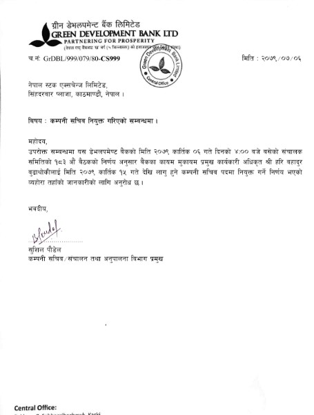 काठमाडौं । ग्रीन डेभलपमेण्ट बैंकको कम्पनी सचिवमा कायम मुकायम प्रमुख कार्यकारी अधिकृत हरिबहादुर बुढाथोकी नियुक्त भएका छन् । कम्पनीको कात्तिक ६ गते बसेको सञ्चालक समिति बैठकले भोलिदेखि लागू हुने गरी बुढाथोकीलाई कम्पनी सचिवमा नियुक्त गरेको हो ।
