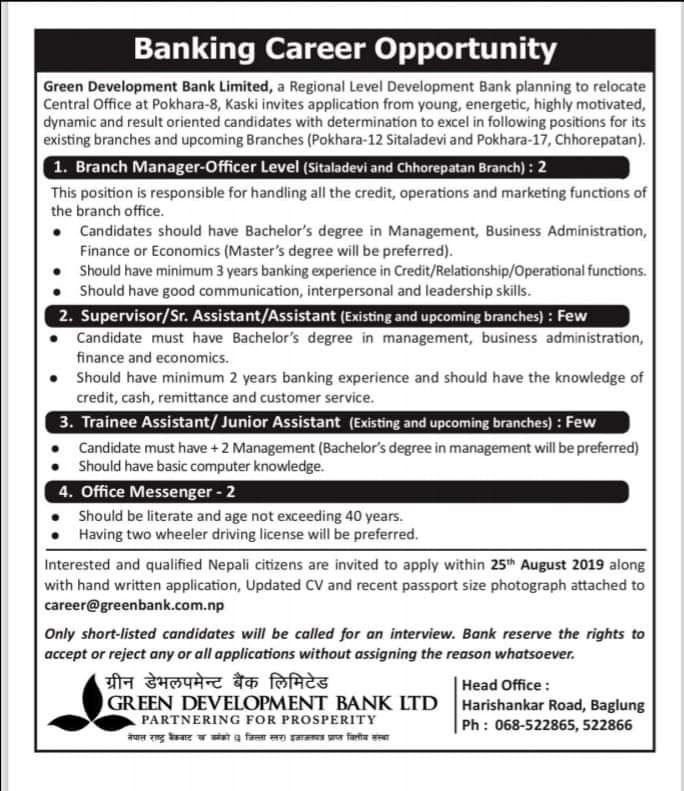 ग्रीन डेभलपमेन्ट बैंकमा रोजगारीको अवसर