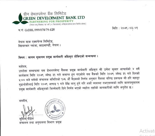 काठमाडौं । ग्रीन डेभलपमेन्ट बैंकमा कायम मुकायम प्रमुख कार्यकारी अधिकृतको जिम्मेवारी हरि बहादुर बुढाथोकीले पाएका छन् । कम्पनीका प्रमुख कार्यकारी अधिकृत उमेश कुमार आचार्यको ४ वर्षे कार्यकाल जेठ ३१ गते समाप्त भएकाले अर्को व्यवस्था नभएसम्मको लागि वरिष्ठ प्रबन्धक बुढाथोकीलाई असार १ गतेदेखि लागू हनुे गरी कायम मुकायम सीईओको जिम्मेवारी दिएको बैंकले जनाएको छ ।