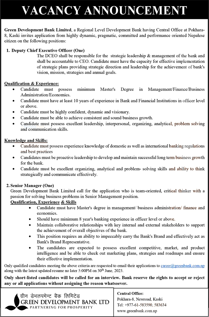 ग्रीन डेभलपमेन्ट बैंकमा रोजगारीको अवसर