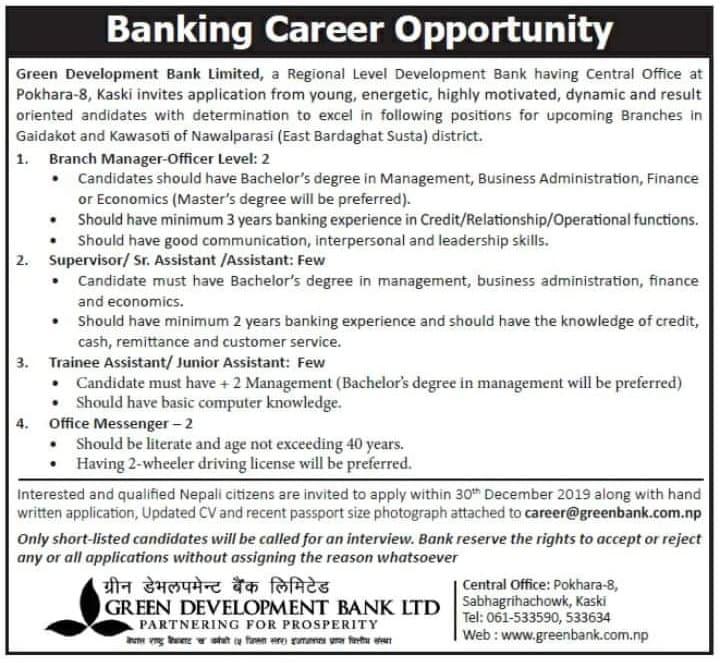 काठमाडौं । ग्रीन डेभलपमेन्ट बैंकले विभिन्न पदका लागि कर्मचारीको माग गरेको छ । बैंकले ब्रान्च म्यानेजर अफिसर लेभलका लागि २ जना, सुपरभाइजरका लागि केही, ट्रेनी असिस्टेन्टका लागि केही, अफिस म्यासेन्जरका लागि २ जना गरी ठुलो संख्यामा कर्मचारीको माग गरेको छ ।