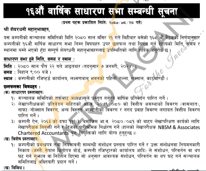 सभाले आर्थिक वर्ष २०७९/८० को वाषिक प्रतिवेदन छलफल गरी पारित गर्नुका साथै चालू आर्थिक वर्षको लागि लेखापरीक्षकको नियुक्ति र निजको पारिश्रमिक निर्धारण गर्ने प्रस्ताव पारित गर्नेछ ।