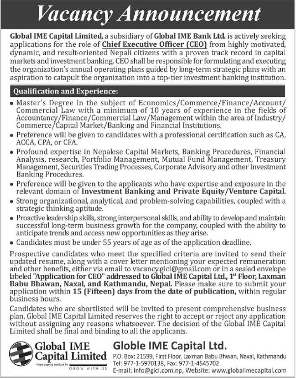 काठमाडौं । ग्लोबल आइएमई क्यापिटलले प्रमुख कार्यकारी अधिकृत (सिइओ) माग गरेको छ । क्यापिटलले सिइओ नियुक्तिको लागि दरखास्त आह्वान गरेको हो । आवेदकले इकोनोमिक्स वा कमर्श वा फाइनान्स वा एकाउन्ट वा कमर्शियल कानुनमा मास्टर्स गरेको हुनुपर्ने र पुँजीबजार वा बैंकिङ क्षेत्रमा १० वर्षको अनुभव भएको हुनु पर्ने जनाएको छ ।