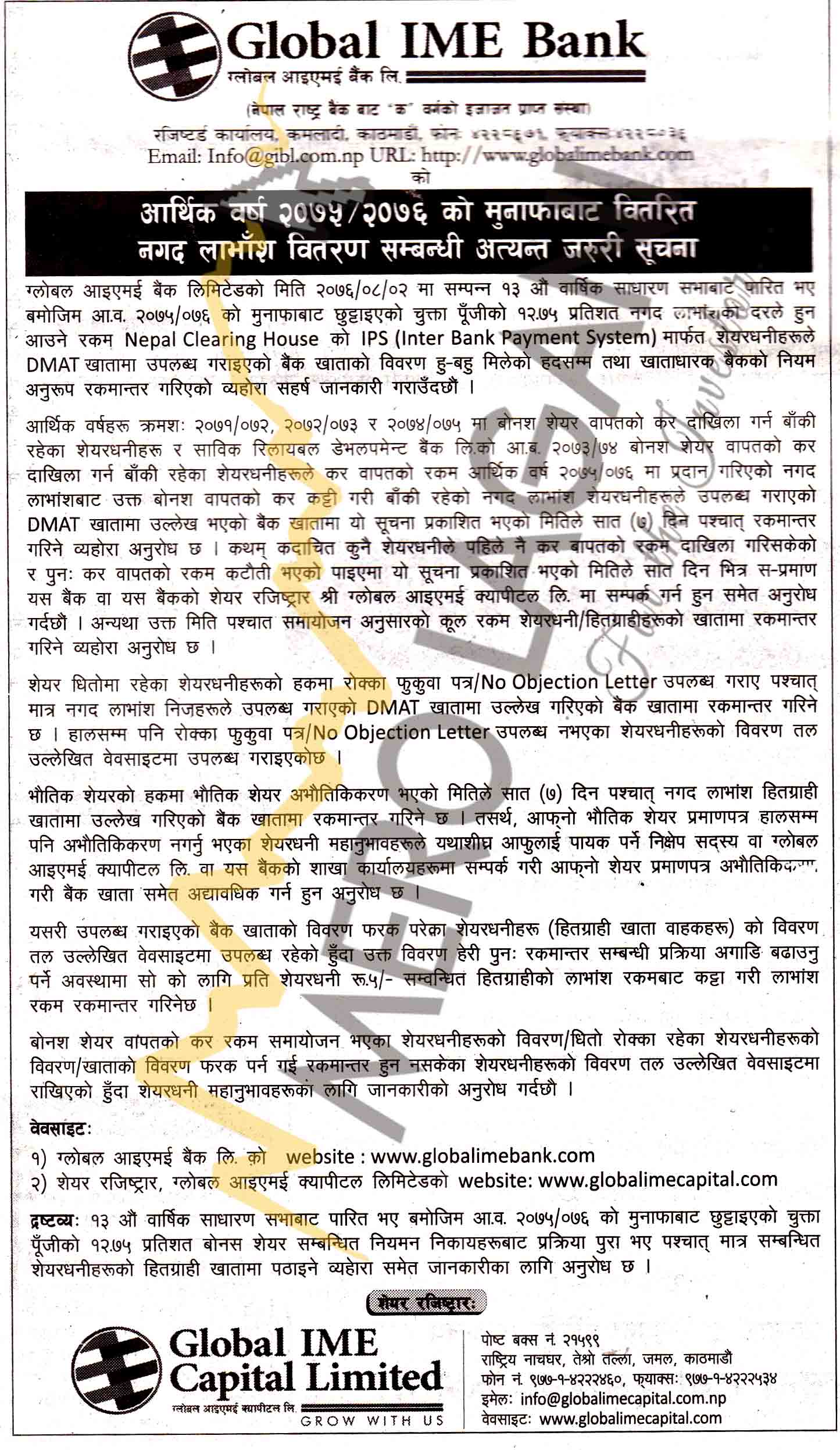 बैंकको पुस २ गते सम्पन्न १३ औँ वार्षिक साधारण सभाले पारित गरेको १२.७५ प्रतिशत नगद लाभांश बैंक खातामा जम्मा गरेको जनाएको छ ।