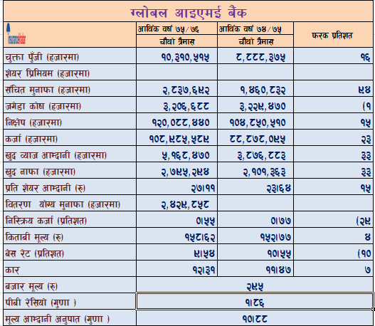 ग्लोबल आइएमई बैंकले गत आर्थिक वर्ष २०७५/७६ को चौथो त्रैमासको वित्तीय विवरण प्रकाशित गरेको छ । आर्थिक वर्ष २०७५/७६ को चौथो त्रैमाससम्म आइपुग्दा २ अर्ब ७९ करोड रुपैयाँ खुद नाफा कमाएको छ । अघिल्लो आर्थिक वर्षको सोही अवधिको तुलनामा बैंकको नाफा ३३ प्रतिशतले बढी हो । अघिल्लो वर्षमा ग्लोबल आइएमई बैंकले २ अर्ब १० करोडरुपैयाँ खुद नाफा कमाएको थियो ।