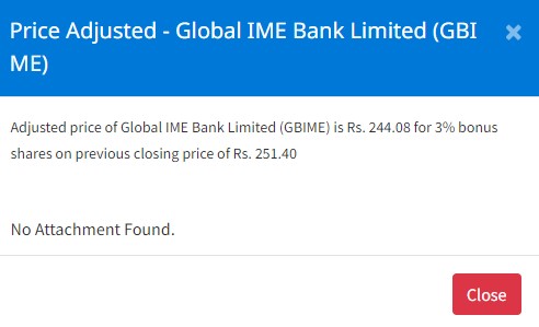 बैंकको आज अन्तिम कायम शेयरमूल्य २५१ रुपैयाँ ४० पैसाको आधारमा नेप्सेले ३ प्रतिशत बोनश शेयर वितरणपछिको शेयर मूल्य समायोजन गरी २४४ रुपैयाँ ०८ पैसा कायम गरेको छ ।