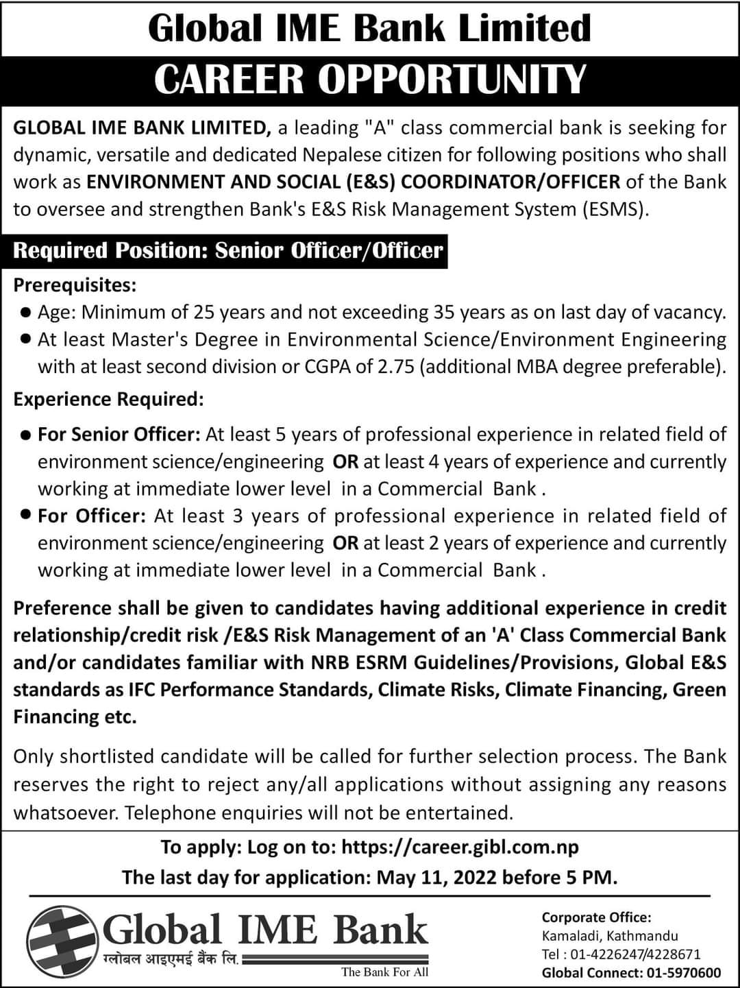 ग्लोबल आइएमई बैंकमा रोजगारीको अवसर, आवेदन दिन एक हप्ता बाँकि