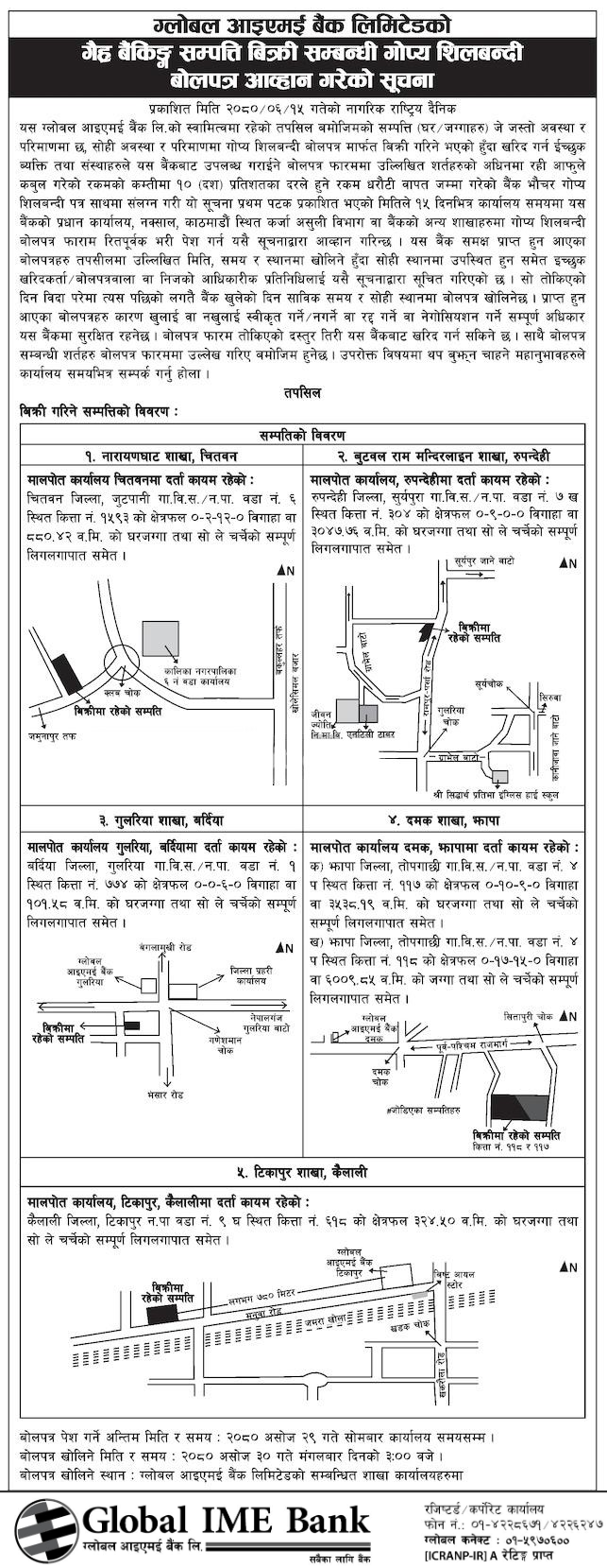 काठमाडौं । ग्लोबल आईएमई बैंकले आफ्नो विभिन्न स्थानको गैह्र बैंकिङ सम्पत्ति घर, जग्गाहरु लिलामी मार्फत बिक्री गर्ने भएको छ । बैंकले उक्त सम्पत्ति जहाँ जे–जस्तो अवस्थामा छ सोही अवस्थामा गोप्य शिलबन्दी बोलपत्र मार्फत बिक्री गर्ने जनाएको हो । बैंकले नारायणघाट शाखा चितवन, बुटवल राममन्दिरलाइन शाखा रुपन्देही, गसरलरिया शाखा बर्दिया, दमक शाखा झापा र टिकापूर शाखा कैलालीमा रहेको सम्पत्ती बेच्न लागेको जनाएको छ ।
