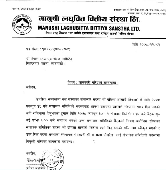 काठमाडौं। मानुषी लघुवित्त वित्तीय संस्थाको सञ्चालक पदमा सम्झना पोखरेल नियुक्त भएकी छिन् । कम्पनीकी संचालक प्रमिला आचार्य(रिजाल) ले घरायसी काम देखाउँदै राजिनामा दिएकी थिइन् । उनले दिएको राजिनामालाई कम्पनीको गत फागुन ३० गते बसेको सञ्चालक समितिको बैठकले स्वीकृती गरी रिक्त रहेको सञ्चालक पदमा पोखरेललाई नियुक्त गरेको हो ।