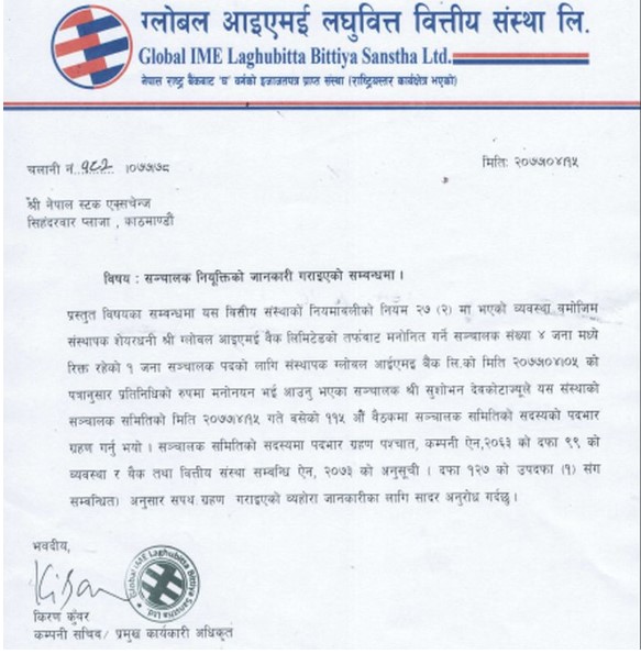 काठमाडौं । ग्लोबल आइएमई लघुवित्तको संचालकमा सुशोेभन देवकोटा नियुक्त भएको छ । कम्पनीको साउन १५ गते बसेको संचालक मितिको बैठकको निर्णय अनुसार उनलाई नियुक्त गरेको हो ।