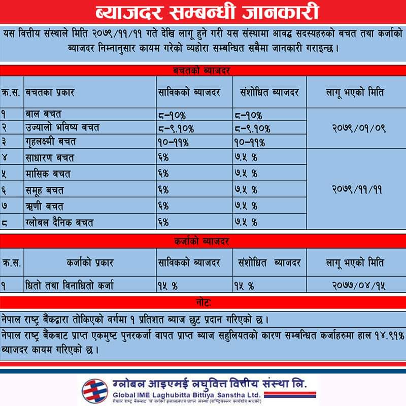 काठमाडौं । ग्लोबल आइएमई लघुवित्तले यस अघि प्रकाकशन गरेको ब्याजदर संशोधन गरेको छ । संस्थाको संसोधित ब्याजदर फेरी सार्वजनिक गेको हो । राष्ट्र बैंकको निर्देशन अनुसार लघुवित्तले ब्याजदर परिवर्तन गरेको हो । संस्थामा आवद्ध बचतकर्ताहरुले न्यूनतम ७ देखि ५ प्रतिशतदखि ब्याजदर पाउनेछन् भने बचतकर्ताहरुले अधिकतम १० देखि ११ प्रतिशतसम्म ब्याजदर पाउने जनाएको छ ।