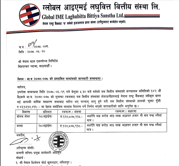 उक्त प्रस्तावित लाभांश नेपाल राष्ट्र बैंकले स्वीकृति दिएपछि कम्पनीको आगामी साधारणसभाले पारित गरेपछि शेयरधनीले पाउनेछन् ।