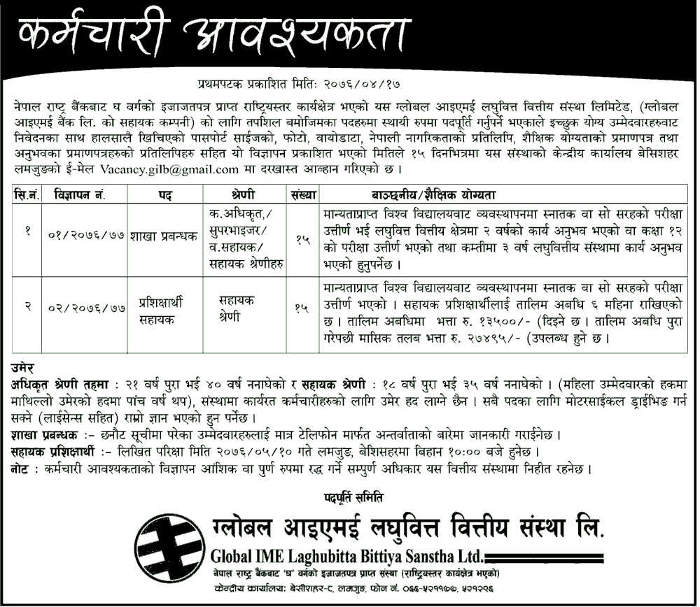ग्लोबल आइएमई लघुवित्त वित्तीय संस्थाले विभिन्न पदका लागि कर्मचारीको माग गरेको छ । संस्थाले (शाखा प्रबन्धक) कनिष्ठ अधिकृत, सूपरभाइजर, बरिष्ठ सहायक पदका लागि १५ जना र प्रशिक्षर्थीका लागि १५ जना गरी ३० जना कर्मचारीको माग गरेको हो ।