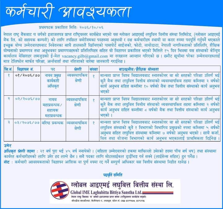 काठमाडौं । ग्लोबल आइएमई लघुवित्त वित्तयि संस्थाले विभिन्न पदका लागि कर्मचारीको माग गरेको छ । संस्थाले नायब प्रमुख कार्यकारी अधिकृतका लागि १ जना, नायब महाप्रबन्धकका लागि १ जना र वरिष्ठ प्रबन्धका लागि १ जना गरी जम्मा ३ जना कर्मचारीको माग गरेको छ ।