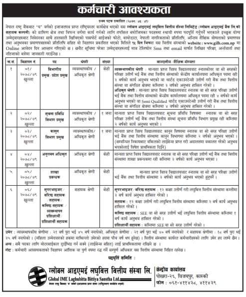 ग्लोबल आइएमई लघुवित्तले माग्यो धेरै संख्यामा कर्मचारी, एसएलसी पासलाई पनि अवसर