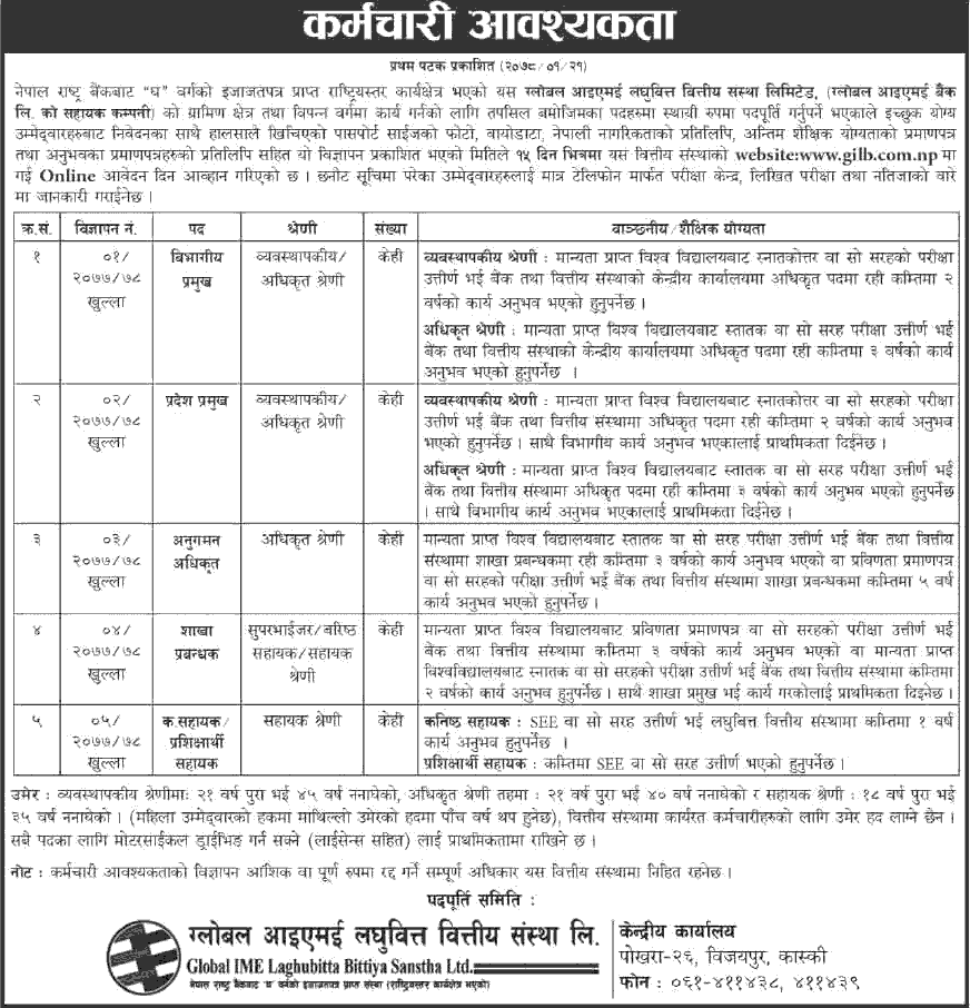 संस्थाले आफ्नो विभिन्न शाखा कार्यालयका लागि कर्मचारीको माग गरेको जनाएको छ । ईच्छुक तथा योग्यता पुगेकाले विज्ञापन प्रकाशित भएको मितिले १५ दिनभित्र आवेदन दिन सक्नेछन् ।