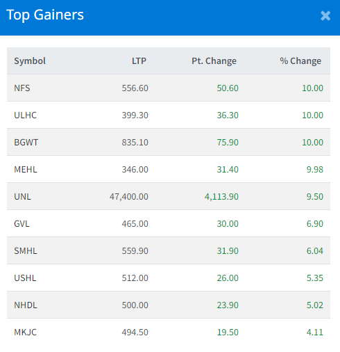 आज सबैभन्दा धेरै नेपाल फाइनान्स, अपर लोहोो भगवती हाइड्रोपावर कम्पनीका लगानीकर्ताले कमाएका छन् । आज यी कम्पनीका लगानीकर्ताले १० प्रतिशतका दरले कमाएका छन् । मनकामना इन्जिनियरिङका लगानीकर्ताले ९ दमलव ९८ प्रतिशतका दरले कमाएका छन् ।