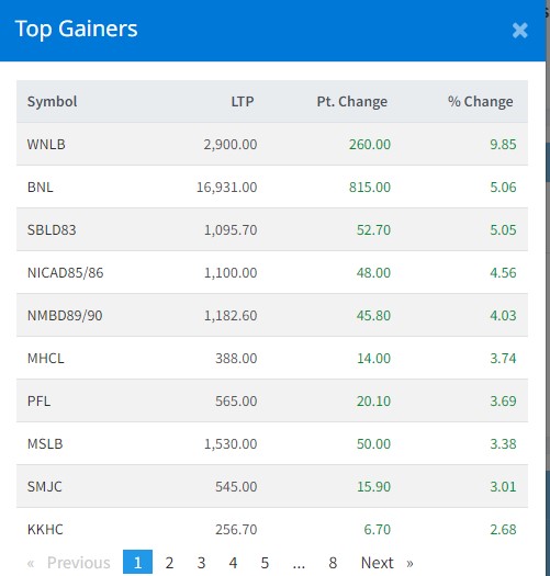 आज सबैभन्दा धेरै विन नेपाल लघुवित्त वित्तीय संस्थाका लगानकिर्ताले कमाएका छन् । आज यस कम्पनीका लगानीकर्ताले ९ दशमलव ८५ प्रतिशतका दरले कमाएका छन् । बोटलर्स नेपाल बालाजूका लगानीकर्ताले ५ प्रतिशतका दरले कमाएका छन् ।