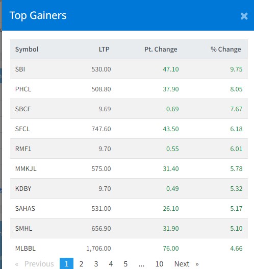आज सबैभन्दा धेरै नेपाल एसबिआई बैंकका लगानीकर्ताले कमाएका छन् । आज यस कम्पनीका लगानीकर्ताले ९ दशलमव ७५ प्रतिशतका दरले कमाएका छन् । पिपुल्स हाइड्रोपावरका लगानीकर्ताले ८ प्रतिशतका दरले कमाएका छन् । सनराइज ब्लुचिप फन्डका इकाईधनीले ७ प्रतिशतका दरले कमाएका छन् ।