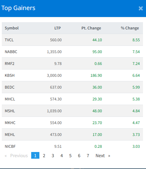 आज दिनभरिमा ३०४ आज सबैभन्दा धेरै त्रिशुली जलविद्युतका लगानीकर्ताले कमाएका छन् । आज यस कम्पनीका लगानीकर्ताले ८ दशमलव ५५ प्रतिशतका दरले कमाएका हुन् । नारायणी डेभलपमेन्ट बैंकका लगानीकर्ताले ७ दशमलव ५४ प्रतिशतका दरले कमाएका हुन् । राबीबी म्युचुअल फन्ड २ का इकाइधनीले ७ दशमलव २४ प्रतिशतका दरले कमाएका छन् ।