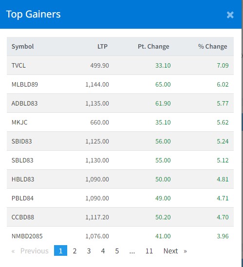 आज सबैभन्दा धेरै त्रिशुली जलविद्युतका लगानीकर्ताले कमाएका छन् । आज यसकम्पनीका लगानीकर्ताले ७ दशलमव ०९ प्रतिशतका दरले कमाएका हुन् । महालक्ष्मी डिबेञ्चरका इकाईधनीले ६ प्रतिशतका दरले कमाएका छन् । एग्रिकल्चर डेभलपमेन्ट बैंक डिबेञ्चरका इकाईधनीले ५ दशलमव ७७ प्रतिशतका दरले कमाएका छन् । मैलुङ खोला जलविद्युतका लगानीकर्ताले ५ प्रतिशतका दरले कमाएका छन् ।
