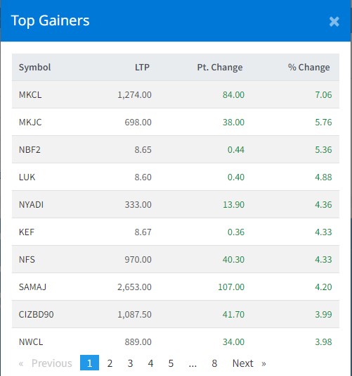 आज सबैभन्दा धेरै मुक्तिनाथ कृषि कम्पनीका लगानीकर्ताले कमाएका छन् । आज यस कम्पनीका लगानीकर्ताले ७ दशलमव ०६ प्रतिशतका दरले कमाएका छन् । मैलुङ खोलाका लगानीकर्ताले ५ दशलमव ७६ प्रतिशतका दरले कमाएका छन् । नविल ब्यालेन्स फण्ड २ का ईकाईधनीले ५ दशलमव ३६ प्रतिशतका दरले कमाएका छन् । लक्ष्मी उन्नती कोषका इकाईधनीले ४ प्रतिशतका दरले कमाएका छन् ।
