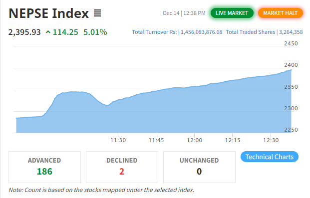 नेप्सेले १२ बजेर ३८ मिनेटमा कारोबार रोकेको हो । अव एक बजेर १८ मिनेटमा कारोबार खुल्नेछ । हिजोका दिनमा प्रचण्डले शेयर बजार सम्बन्धी नकारात्मक टिप्पणी गर्दा बजारमा पहिरो गएको थियो । प्रचण्डलाई कारण देखाएर बजार घटाएका लगानीकर्ताले आज भने एकै दिन ११४ अंकले बढाएका छन् ।