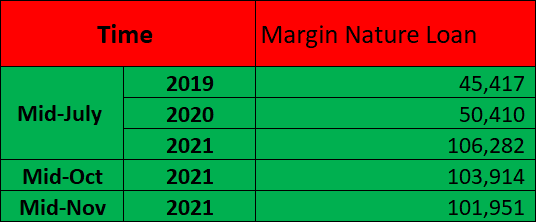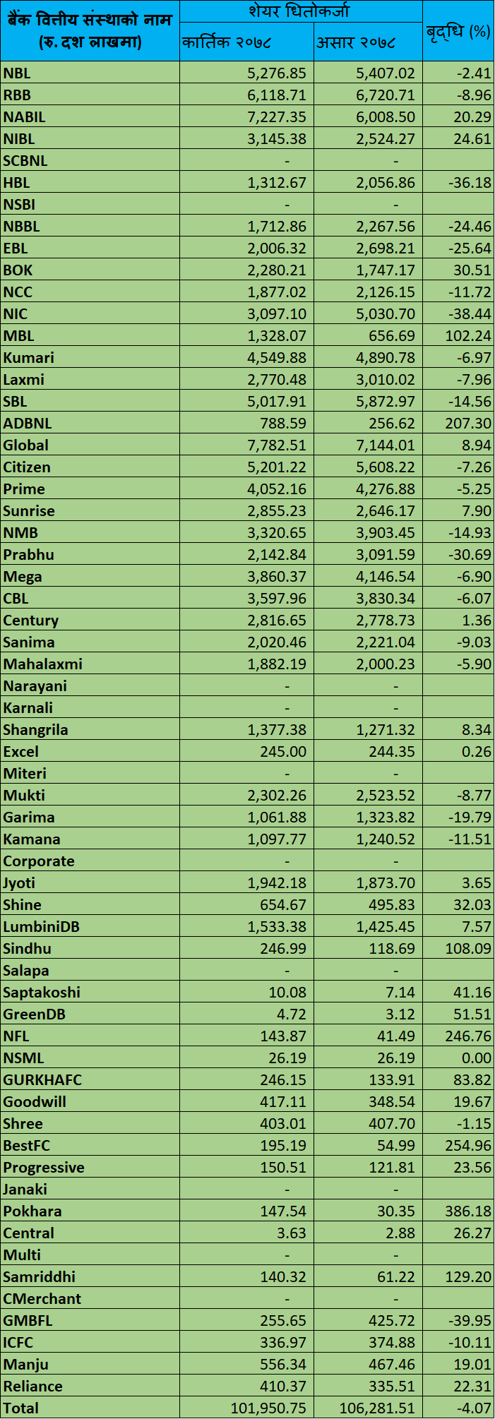 अर्को तर्फ शेयर बजार लगातार तल झर्ने क्रममा मार्जीन कलका कारणले पनि लगानीकर्ताले शेयर धितो कर्जा सल्टाइरहेका छन् । यो तथ्याङ्क कार्तिक महिनाको हो । मंसिर महिनाको तथ्याङ्क हेर्ने हो भने यस्तो रकम थप घट्ने विश्लेषकहरु बताउछन् ।