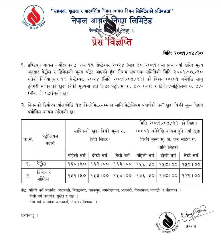 अब मूल्य घटेसँगै पेट्रोल प्रतिलिटर पहिलो वर्गमा १५६ रुपैयाँ, दोस्रो वर्गमा १५८ र तेस्रो वर्गमा १५९ रुपैयाँ कायम भएको छ । डिजेलको मूल्य लिटरमा ५ रुपैयाँ घटेर प्रतिलिटर १४६ रुपैयाँ कायम भएको छ । दोस्रो वर्गमा १४८ र तेस्रो वर्गमा १४९ रुपैयाँ कायम भएको निगमले जनाएको छ ।