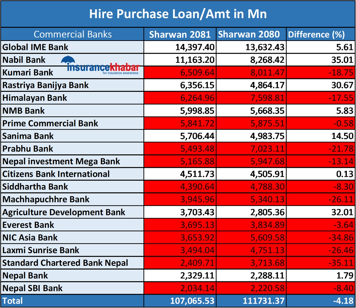गत वर्षको तुलनामा ८ वटा वाणिज्य बैंकहरुबाट गएको गाडी कर्जा बढेको छ भने १२ वटाको घटेको छ। ग्लोबल आइएमई, नबिल, राष्ट्रिय वाणिज्य, एनएमबि, सानिमा, सिटिजन्स, कृषि विकास र नेपाल बैंकबाट गएको गाडी कर्जा बढेको छ।