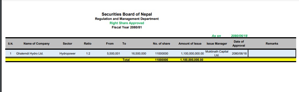 अब कम्पनीले अनुमति पाएसँगै कम्पनीले १ करोड १० लाख कित्ता हकप्रद शेयर निष्काशन गर्नेछ । विक्री प्रबन्धक मुक्तिनाथ क्यापिटल लिमिटेड रहेको छ ।