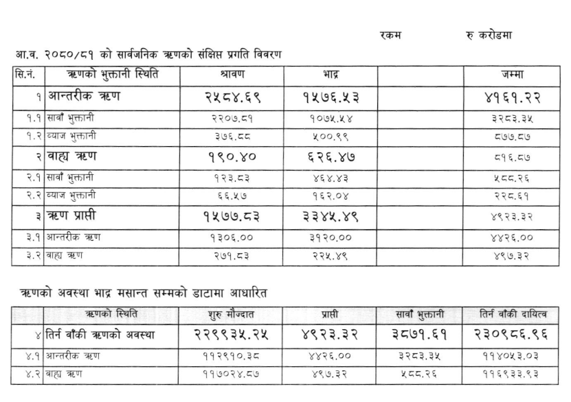 गत आर्थिक वर्ष २०७९।८० सम्म २२ खर्ब ९९ अर्ब ३५ करोड २४ लाख रहेकाे ऋण दायीत्व भदाै महिनासम्म आइपुग्दा १० अर्ब ५१ कराेड रुपैयाँले वृद्धि भएकाे छ। कुल गार्हस्थ्य उत्पादनकाे दाँजाेमा कुल राष्ट्रिय ऋण दायीत्व ४३ प्रतिशत बराबर पुगेको छ। नेपालकाे कुल गार्हस्थ उत्पादनकाे आकार ५३ खर्ब ८१ अर्ब ३३ करोड रुपैयाँ बराबर छ।