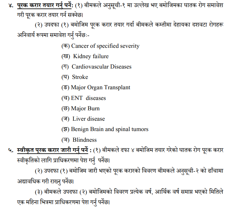 प्राधिकरणले जारी गरेको पूरक करार मार्ग दर्शनमा पूरक करारभित्र निश्चित गम्भीरताको क्यान्सर, मिर्गौला रोग, मुटु रोग, घात, मुख्य अंग प्रत्यारोपण, आँखा, नाक, घाँटीसम्बन्धी रोग, सघन जलन, कलेजो रोग, मस्तिष्क तथा मेरुदण्डको क्यान्सर, अन्धोपनसम्बन्धी जोखिम अनिवार्य रुपमा समावेश गरिएको हुनुपर्ने प्रावधान छ।