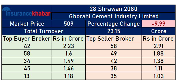 आजको फ्लोरसिट हेर्दा कम्पनीको शेयर ब्रोकर नम्बर ४२ बाट सर्वाधिक रकमको खरीद भएको छ । ४२ नम्बर ब्रोकरबाट कम्पनीको २ करोड २३ लाख बराबरको खरीद भएको छ । त्यस्तै विक्री तर्फ ब्रोकर नम्बर ५८ बाट सर्वाधिक रकमको विक्री भएको छ। ब्रोकर नम्बर ५८ बाट २ करोड ९१ लाखको विक्री भएको छ ।