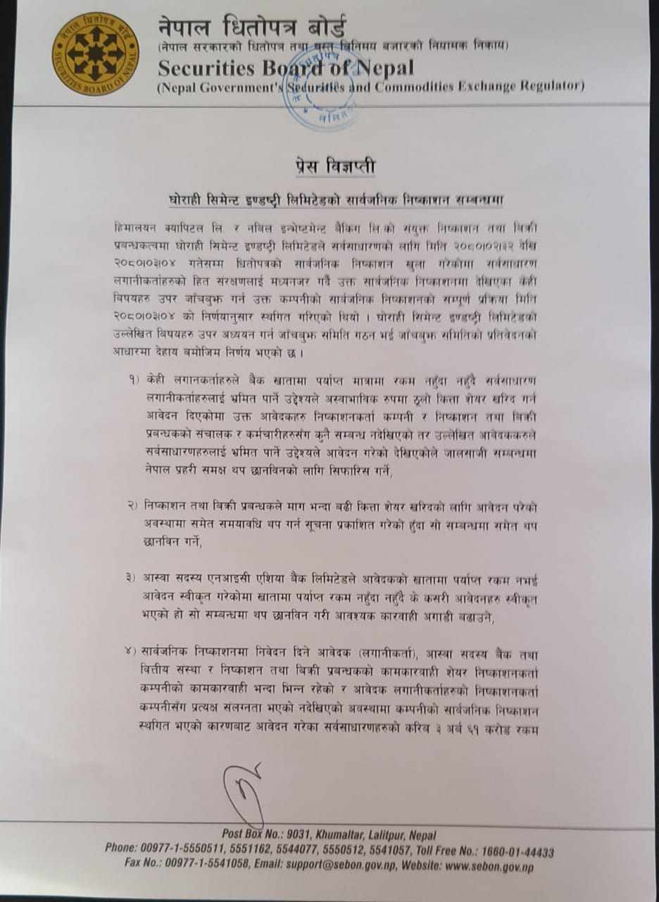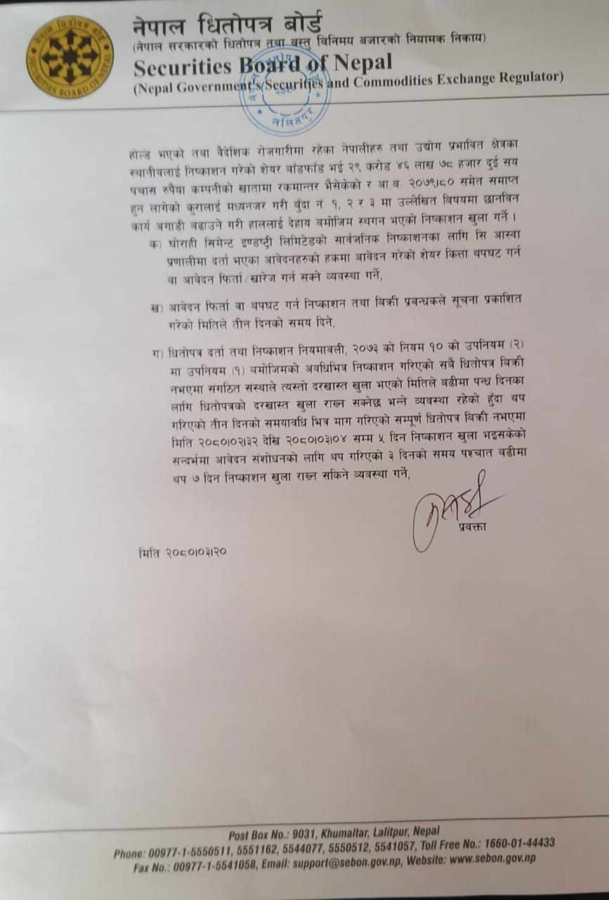 काठमाडौं । नेपाल धितोपत्र बोर्डले घोराही सिमेन्टलाई आइपिओ निष्काशनका लागि पुन अनुमति दिएको छ । कम्पनीको आइपिओ बिक्री भएको देखाउन केहि व्यक्तिहरुले बैंकमा पर्याप्त पैसा नभइ आवेदन दिन लगाएको भन्ने उजुरी पछि धितोपत्र बोर्डले कम्पनीलाई आइपिओ निष्काशन तथा बिक्रीका लागि रोक लगाएको थियो ।