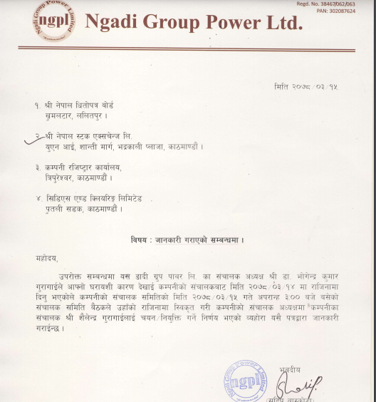 कम्पनीका यस भन्दा अगाडिका अध्यक्ष डा. भोगेन्द्र कुमार गुरागाईंले व्याक्तिगत कारण देखाई सञ्चालक पदबाट राजिनामा दिएका थिए । उनको राजिनामा असार १५ गते स्वीकृत गरी शैलेन्द्र गुरागाईं नियुक्त गरेको जनाएको छ ।
