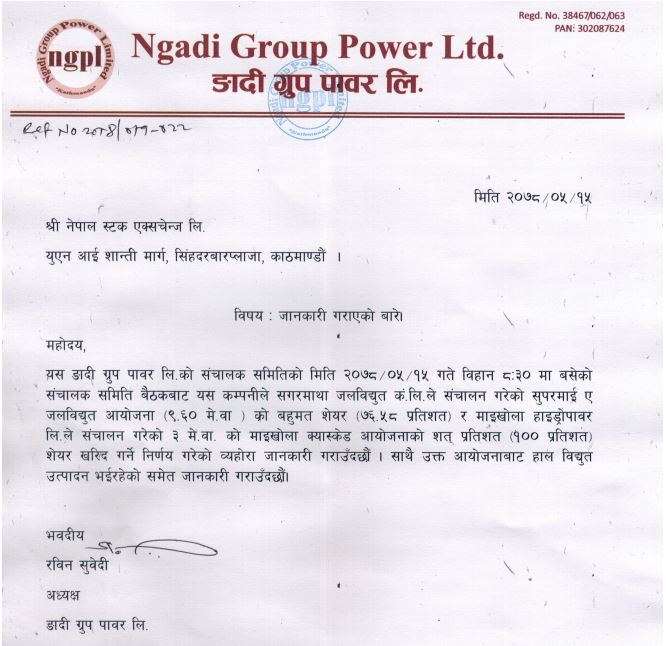 कम्पनीले सगरमाथा जलविद्युत कम्पनी लिमिटेडले संचालन गरेको सुपरमाई ए जलविद्युत आयोजना (९.६० मेगावाट) र माइखोला क्यास्केड आयोजना (३ मेगावाट) को शेयर खरिद गर्ने एक सुचना जारी गर्दै जनाएको छ ।