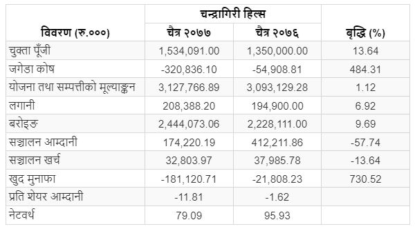 काठमाडौं । चन्द्रागिरि हिल्स चालु आर्थिक वर्ष २०७७/७८ को तेस्रो त्रैमासिक अवधिमा १८ करोड ११ लाख रुपैयाँ नोक्सानमा देखिएको छ । गत आर्थिक वर्ष २०७६/७७ को यहि अवधिमा हिल्सको नोक्सान २ करोड १८ लाख रुपैयाँ मात्रै थियो ।