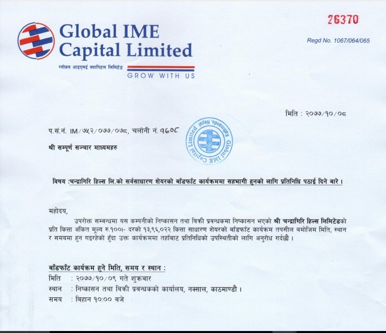 काठमाडौं । चन्द्रागिरी हिल्सको आइपीओ भोलि बाँडफाँड गरिने भएको छ । शुक्रबार बिहान साढे १० बजे कम्पनीको आईपीओ बाँडफाँड गर्न लागिएको ग्लोबल आइएमई क्यापिटलले जनाएको छ।आईपीओ बाँडफाँड काठमाण्डौको नक्सालस्थित क्यापिटलको कार्यालयमा हुनेछ।