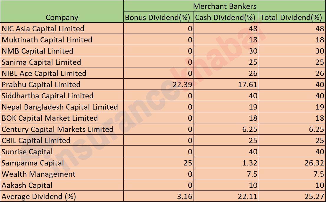 हालसम्म १५ वटा मर्चेन्ट बैंकहरुले लाभांश घोषणा गरेका छन् । लाभांश घोषणा गरेका मर्चेन्ट बैंकहरुको औषत लाभांशदर २५.२७ प्रतिशत रहेको छ । अधिकाम्सले बोनस शेयरलाई भन्दा नगद लाभांशलाई प्राथमिकता दिएका छन् । औषतमा २५.२७ प्रतिशत लाभांश घोषणा गर्दा नगद २२.११ प्रतिशत छ भने बोनश शेयर १.१६ प्रतिशत रहेको छ ।