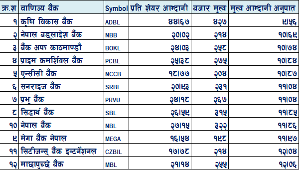 मुल्य आम्दानी अनुपातको आधारमा कृषि विकास बैंकको सबै भन्दा थोरै छ । जसकोे मूल्य आम्दानी अनुपात ९ दशमलव ५६ गुणा रहेको छ ।