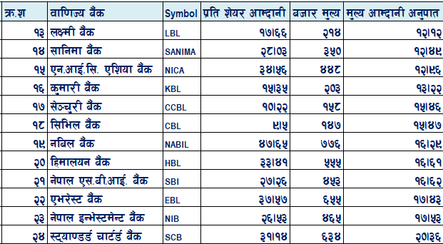 त्यसैगरी सबैभन्दा धेरै मुल्य आम्दानी अनुपात स्टाण्डर्ड चार्टर्ड बैंकको रहेको छ । जसको मूल्य आम्दानी अनुपात २० दशमलव ३६ गुणा छ ।
