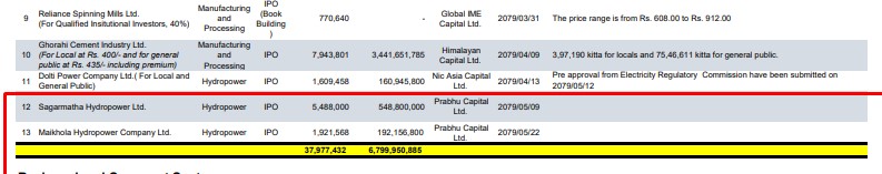 सगरमाथाले आयोजना प्रभावित स्थानिय र सर्वसाधारणलाई गरि कुल ५४ करोड ८८ लाख रुपैयाँ बराबरको ५४ लाख ८८ हजार कित्ता शेयर निष्काशनको लागि अनुमति माग गरेको हो । त्यस्तै माइखोलाले १९ करोड २१ लाख ५६ हजार ८ सय रुपैयाँ बराबरको १९ लाख २१ हजार ५ सय ६८ कित्ता शेयर निष्काशनको लागि अनुमति माग गरेको हो । दुवै कम्पनीको बिक्रि प्रबन्धकमा प्रभु क्यापिटल रहेको छ।